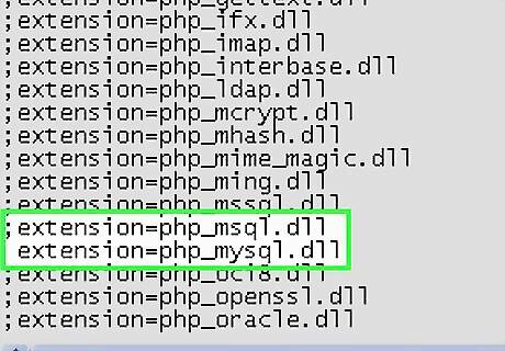 Find the line that reads: ;extension=php_mysql.dll Delete the ; so that the line now reads: extension=php_mysql.dll