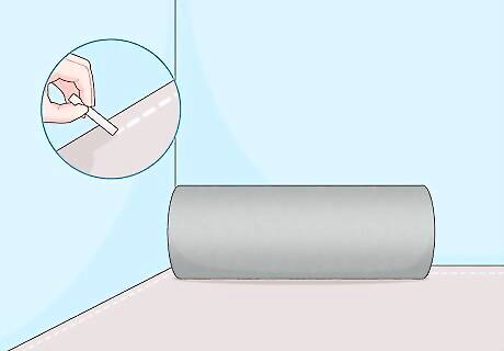Outline vents, pipes, and other obstacles on the underlayment. Use a tape measure to determine the length and width of pipes and other obstacles. Sketch the measurements on top of the underlayment using a marker or chalk. For obstacles in the middle of the room, extend one edge of the outline so it's about ⁄8 in (1.6 cm) longer than the obstacle you're working around. Also, mark where you need to cut the underlayment to fit against the walls. The double outline will allow you to cut a second patch out of the underlayment. Glue that patch back in place after you finish installing the underlayment roll. Keep in mind that the underlayment material won't perfectly align with obstacles. You may need to cut along the sides of 2 rolls to fit them around a pillar, for instance.