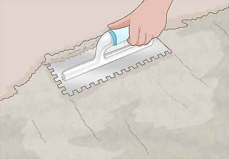 Spread the mortar across the floor with a trowel. Starting on the far end of the room, roll up the underlayment. Add the mortar directly to the subfloor. Move in one direction only, spreading the mortar into a consistent layer no more than ⁄16 in (0.48 cm) thick. Fill in the entire exposed floor with mortar. You're better off working on one section of the underlayment at a time. If you try to cover the entire floor, the mortar will get messy and dry out before you get a chance to put the underlayment back in place.