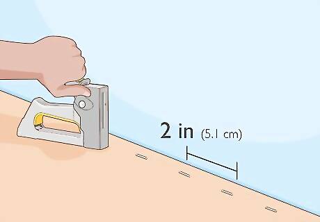 Staple every 2 in (5.1 cm) along the outer edges of the boards. Work on one board at a time, starting with the biggest ones up against the wall. Load a pneumatic stapler with galvanized ⁄8 in (2.2 cm) underlayment staples. Measure in ⁄2 in (1.3 cm) from the edges of the boards, then place a staple every 2 in (5.1 cm) along the underlayment. Secure the sides closest to the walls. Leave the other sides alone and staple them in the next step. You could also use a nail gun to nail the underlayment to the floor. However, make sure the galvanized nails you use are short enough to avoid puncturing all the way through the subfloor.