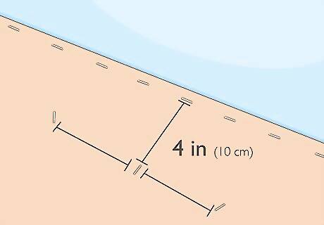 Finish stapling the boards with staples spaced 4 in (10 cm). Measure in from the initial rows of staples you made to fasten the boards to the floor. Then, add rows of staples all the way across each board. Make sure you space the staples out evenly. When you're done, the board should feel stuck to the floor so you can move on and finish securing the rest of the boards. Some brands of underlayment come with markings showing you where to attach the staples. You can follow the markings diagonally across the boards, placing staples as you move.