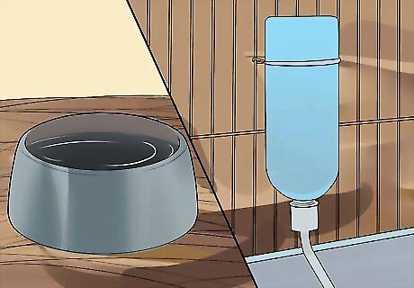 Put in a water bowl or bottle. Water is a choice usually between a ceramic bowl and a water bottle clipped to the side. The water bottle is a bit cleaner as the guinea pigs cannot accidentally scatter cage material into the water like they could with the bowl. However, the bottle tends to drip and get wet whatever part of the cage is under it including any bedding. Also, guinea pigs tend to pull at the bottle and can bang it against the cage sides making quite a lot of noise. If you opt for the water in a ceramic bowl option you will need to spot check it for cleanliness more often. If you opt for the water bottle try a plastic or glass version (plastic is more common) in a 32-ounce size. Make sure it has an angled stainless steel tube with a ball bearing to plug up the spout. For the water bowl or bottle you should change the water once a day and clean the container.