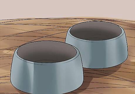 Place a ceramic food bowl in the cage. It should be wide and shallow. This will prevent the guinea pigs from tipping it. For two or three guinea pigs a single bowl should be enough as each pig needs about 1/8th of a cup of guinea pig pellet food per day. Check the food bowl periodically for shavings and other objects scattered in by the guinea pigs that need to be cleaned out.