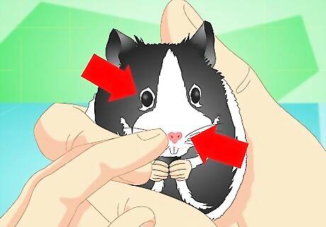 Check your hamster's nose and eyes. If you want to keep your hamster healthy, you'll need to periodically make sure he's not showing signs of illness. As hamsters are prone to colds and infections, check his nose and eyes on a weekly basis. Check your hamster's nose. If it's wet or you notice running or discharge, he may have a cold. You should monitor his symptoms for a few days and take him to the vet if he does not improve. Hamsters can catch colds from humans, so avoid handling your hamster if you've been sick. A hamster's eyes should be clean and clear. Unusual discharge or reddish eyes can be a sign of infection. Certain breeds of hamsters, like Winter Whites, get eye infections easily. You should not wait out an eye infection as infections often require antibiotics. Take your hamster to a vet if you notice anything wrong with his eyes. If your hamster is having nose and eye irritation and medical causes have been ruled out, he may be allergic to something in his cage. Remove any new items, like new toys or accessories, and see if symptoms improve. You may also want to try a different bedding or litter.