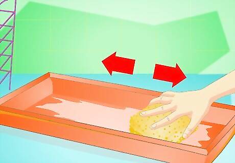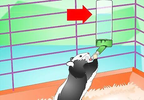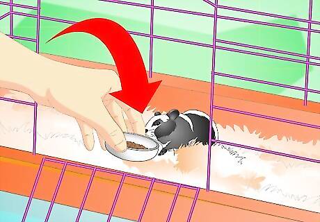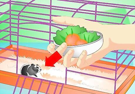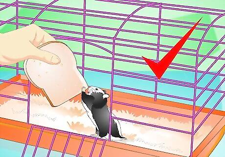 Clean the cage regularly. You should clean your hamster's cage on a weekly basis. An unclean cage can cause a build-up of bacteria, resulting in illness. To start, place a few handfuls of bedding in a pet carrier, cardboard box, or other hamster-safe container. Secure your hamster here during the cleaning process. You might also want to add some water and food in case your hamster gets hungry or bored during the process. Throw away all the bedding and droppings. Any toys made of disposable materials like cardboard should also be thrown away. You can wash other toys and your hamster's food and water bowls in warm water and mild dish soap. Take a sponge and scrub down your hamster's cage with mild dish soap or a disinfectant spray. Get everywhere, including the bars or sides of a cage. Remember to rinse thoroughly when you're done. Hamsters chew so you want to make sure all soap or disinfectant is removed. Dry the cage and add a layer of fresh bedding. Replace any cardboard toys or accessories. Place the washed toys, food bowl, and water bottle back in the cage. Now, you can safely return your hamster to his cage.