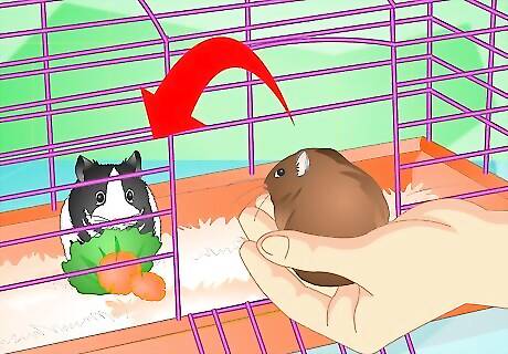 Take precautions when introducing a new hamster. Hamsters are not always friendly to new pets. If you're going to introduce a second hamster, do so when your current hamster is still young. Also, do not place a male and female in the same cage unless you want them to breed. Hamsters are very fertile and a female can give birth to 3 to 18 babies every 30 days. If you do add a new hamster, you should spend several days introducing them. Keep your hamsters in separate cages where they can see each other for a few days. When you do place them in the same cage, keep an eye on them to make sure there's no fighting. You might want to wear protective gloves during the introduction. In the event of a fight, you may have to separate the hamsters.