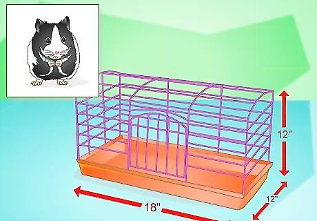 Pick the right cage. For starters, you want to make sure you get your hamster the right type of cage. Hamsters require spacious cages. Your cage should be, at minimum, 12 inches wide by 12 inches high by 18 inches long. However, bigger is usually better. If you have more than one hamster, or a larger type of hamster, invest in a larger cage. Hamsters catch colds easily. Therefore, place your hamster's cage in a warm area of your home away from doors or windows that cause drafts. Pick a safe and stable place to keep the cage where it's unlikely to get accidentally knocked over or disturbed. Hamster cages usually come with either plastic or wire bars. However, hamsters are known to chew so keep an eye on the cage's bars to make sure your hamster is not wearing them down. If he escapes, he could get into an accident. You can also get aquarium style cages if your hamster has a habit of chewing through bars. If you go this route, make sure to keep your cage out of direct sunlight. Aquariums heat up easily.