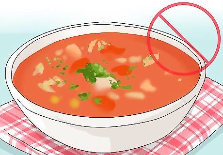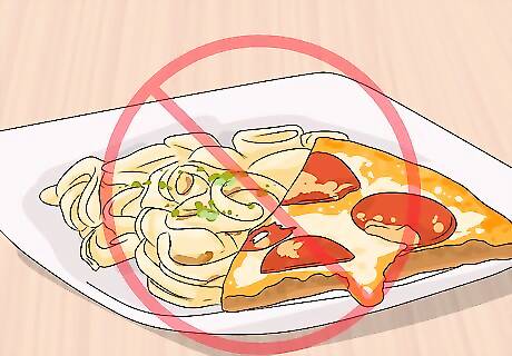 Avoid excessive fats. Fats are the most dense macronutrient, and can take as long as eight hours to digest. Foods like pizza or fettuccini alfredo can make you bloated, sleepy, and give you indigestion.