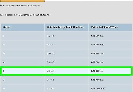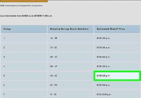 Find your block’s scheduled shutoff time on the PG&E outage table. Go back to the first tab with the PG&E site and scroll down to the shutoff time table. Find the range in the center column that your block number fits into. If a range says something like “2D–3C,” then the range contains anything from 2D–2Z and 3A–3C. Check the corresponding time in the third column to find out when you’re expected to lose power in PST. For example, if you’re in the range 1K–1R, then you can expect to lose power on August 18th at 4 PM PST.