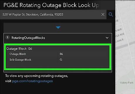 Combine your outage and sub outage block to get the block number. Look in the box underneath the search bar to find the outage block and the sub outage block. The outage block is a number while the sub outage block is a letter. The number and letter together will form your complete outage block number. For example, if the outage block says “3” and the sub outage block says “G”, then your block number is 3G. If the outage block says “50,” it will not have an sub outage block. If you see “No features found that meet the search criteria” instead of an outage block number, then you won’t be affected by the rolling blackouts.