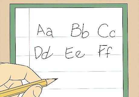 Start with the alphabet. Write the alphabet out with your right hand. Underneath it, attempt to match each letter using your left hand now that it is strong enough to do so. Remember to practice uppercase and lowercase. Write in the mirror. Place a mirror facing your paper and write with your right hand. This mirror image will help your brain imagine the same action for your left hand. Buy a writing book. Trace the dotted lines to form letters and get the form correct on your letters. Secure the paper to your writing surface so it doesn't slide around when you're trying to write. Repeat as necessary. Some letters will be more difficult than others for you. Repeat the difficult ones as many times as necessary to get it right.