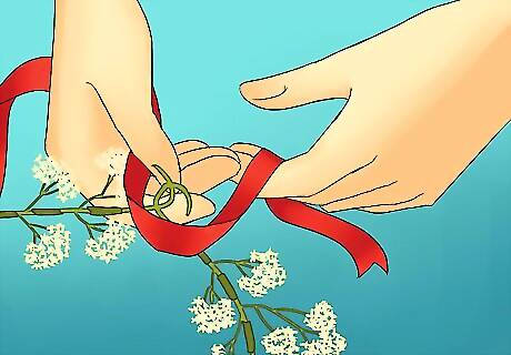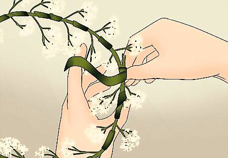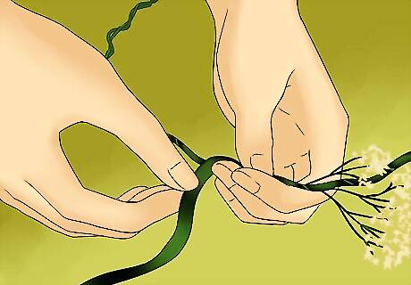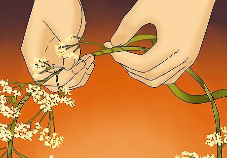 Create a circle. Once you have reached the end of the stalk, carefully bend it into a circle to create the shape of the crown. Use floral tape to attach the two ends together. You can then fill in any gaps with more baby’s breath. Simply attach small bunches using the floral tape. You can also wrap a ribbon around the crown in order to make the base more stable.