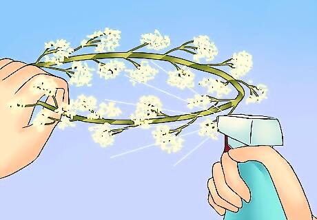 Spray with water. Once you are finished constructing the baby’s breath crown, you should spray it with water in order to keep it fresh. For instance, you may be making these crowns the day before a wedding. A light spray of water can help them stay fresh. You should also keep the flowers in the refrigerator.