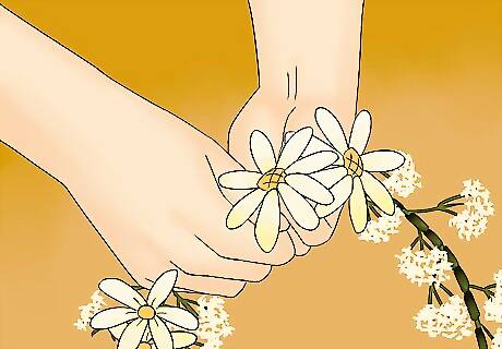 Include other flowers. You can also add other flowers to the crown to give it a pop of colour. Baby’s breath can still be the dominant look, but you may want to add a few small daisies or some greenery. You can simply tape these additional flowers onto the crown the same way that you attached the baby’s breath. Disperse other flowers or greenery throughout the crown.