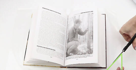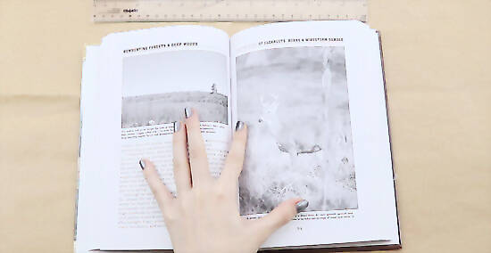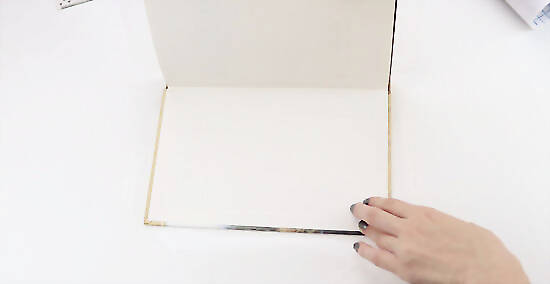 Lift the bottom of the book off the plastic paper, leaving the front cover flap in place. You want to lift the book to reveal the spinal tabs you cut. Then fold down the spinal tabs toward the center of the paper. Gently lower your book back down over the folded tabs.