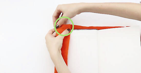 Open the back cover of the book. Fold the right edge of the fabric in over the cover. Repeat the same process for the other cover, pinning the flaps of fabric together.