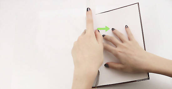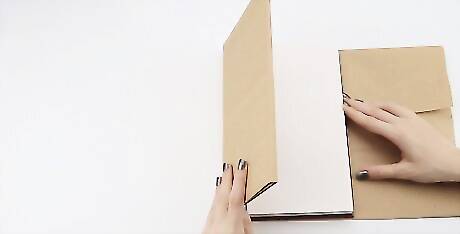 Open the front cover of the book. Fold the left edge of the paper in over the cover. With the front cover open, take the left side of your paper and fold it over the cover. If you have too much paper and the fold goes too far for your liking, cut the excess paper.
