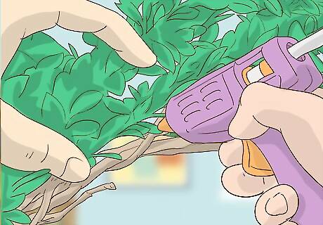 Fill in the gaps. Once you have completed your wreath, go back over it and look for any gaps. If you see any gaps, fill them in with shorter pieces of boxwood. Make sure that no grapevine (except for the back) is showing. If the sprigs won't stick, secure them with a drop of hot glue.