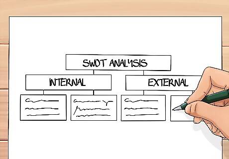 Do a SWOT analysis. You will want to figure out everything about your company's position in the marketplace. SWOT is a technique that was developed by business experts in the 1960s to help businesses come up with a concrete action plan to improve their practices. Four key aspects make up a SWOT analysis. One computer company CEO says his company does the SWOT analysis each quarter. The company uses collective knowledge by involving all employees in the analysis, and the CEO believes the analysis helps the company spot blind spots. Other companies use SWOT analysis as part of the strategic planning process. Sometimes companies will gather employees for a brainstorming session that uses the four-step SWOT analysis. Doing a SWOT analysis can help you figure out how to brand and position your company in your logo. The first two elements of the SWOT analysis are internal factors faced by a company. The second two are external. What are your company's strengths? This is the first question in a SWOT analysis. Be realistic when you assess your company's strengths and consider competition when doing so. Branding, pricing, and other location are elements that are often considered. What are its weaknesses? Don't focus too much on gray areas. You don't want to have too much complexity in a SOT analysis. What threats does it face? This is the third part of the SWOT analysis, and it focuses on customers and competition, as well as any other external threats. What opportunities exist?