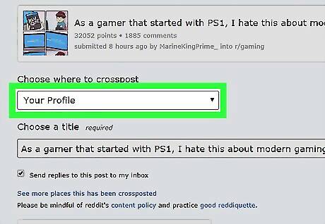 Select a subreddit to crosspost. Click the drop-down menu below "Choose where to crosspost," and select a subreddit to crosspost the selected link or text post.