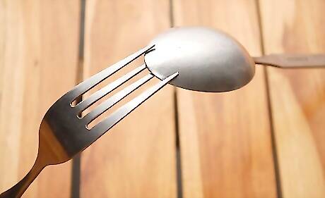 Hook the fork and spoon together. Put the two outside tines of the fork over the back of the spoon When they're connected, the utensils should make sort of a boomerang shape.