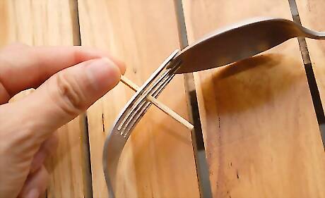 Get a matchstick or toothpick, and place it between the center prongs of the fork. Ensure that it is still touching the spoon. Leave as much of the matchstick sticking towards the center of the "boomerang" shape as possible.