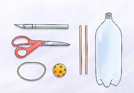 Gather materials needed. Plastic bottle (two liter bottle works great) Rubber band Two skewers Ball (a small wiffle ball works best) Scissors X-acto Knife