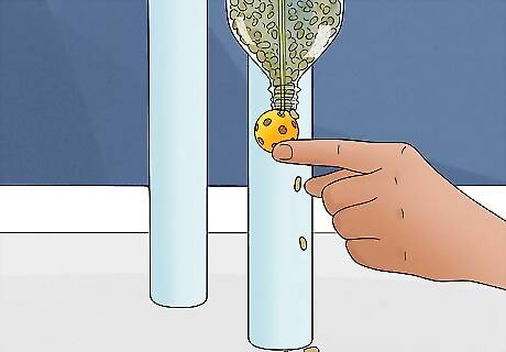 Test the feeder. Make sure that when the ball is hit lightly food will fall from the bottle. If the food does not come out or it takes too much force for the food to come out you should either get a looser rubber band or make lower holes for the skewer to be placed.