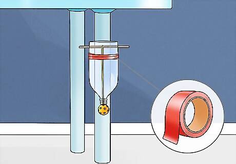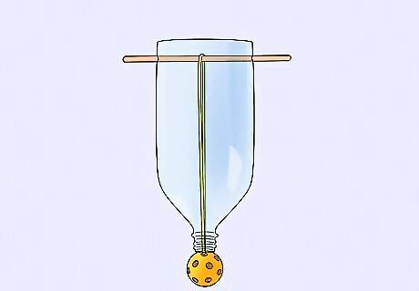 Assemble. Tie the rubber band through two holes in the wiffle ball. Insert the rubber band through the top of the bottle so the ball hangs outside of where the cap would be. Take the skewer and place it through the rubber band, then insert it in the cross cut holes so that the rubber band is holding the ball in place.