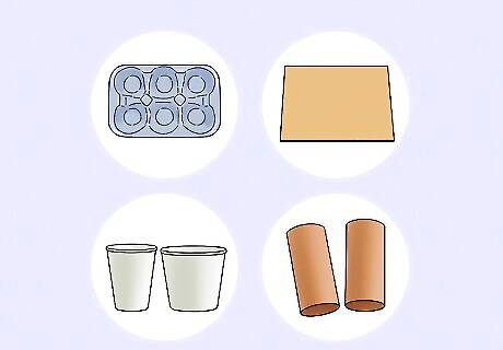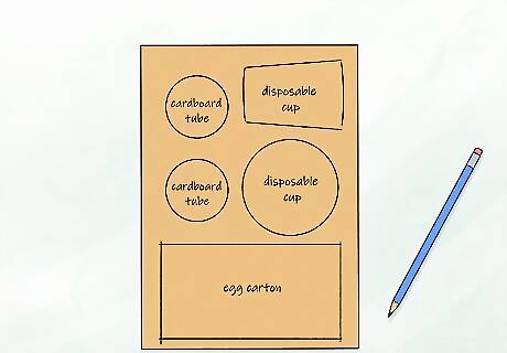 Gather the materials. To assemble the board you will need glue and scissors. With your design plan in mind gather materials you will need. Some suggested materials would be: Egg cartons Paper towel rolls Rope Plastic containers Popsicle sticks A flat piece of cardboard or plastic to use as the base