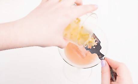 Gently release the two halves from each other. Place a strainer on the cocktail glass and strain the contents in the martini glass.