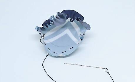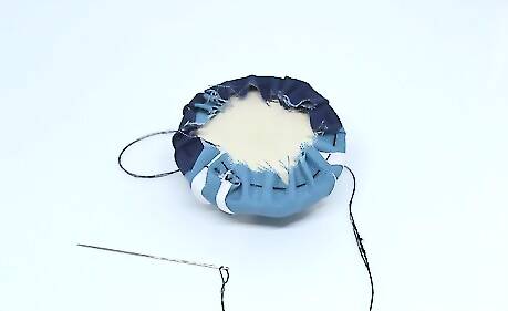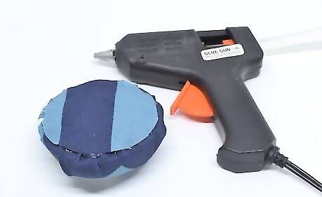 Tuck the disk into the pincushion and finish the gathering. Tuck the disk part of the lid into the pincushion so that the underside is visible through the hole. Pull on the threads so that the gathering is tight, then knot and cut them off. If you want to, hot glue the gathered edges of the fabric to the underside of the lid.