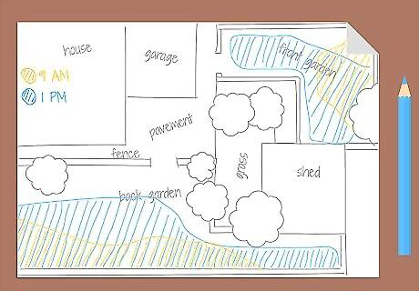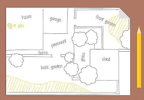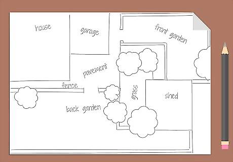 Sketch a map of your yard. Draw a basic map of the area that you want to use for gardening. Include the relative locations of anything large enough to cast a shadow such as buildings, fences, and trees. Scale is not important. Mark out the basic area of where you want to plant your garden as well.