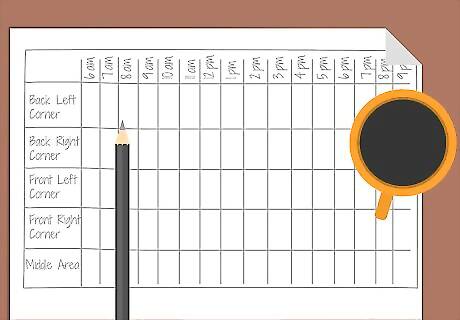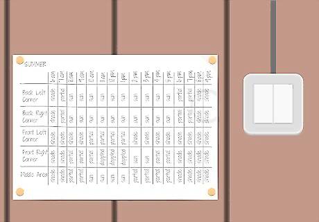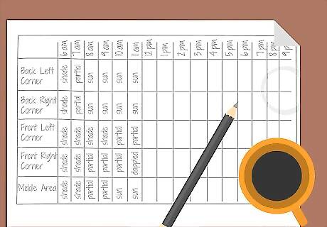 Divide your yard into regions. For this type of sun chart, you'll want to divide your garden into separate regions and observe the sunlight in each one. You can split it up however you want. You don't want the regions to be too large, as half of one may be in sunlight and half in shade. Give your regions distinct names so you remember each one when taking sun observations: Back left corner, front right corner, middle left, etc. Ask a landscape architect or garden store associate what size regions might make the most sense given the size of your yard.