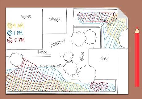 Record observations of the sun at 5:00 PM in red colored pencil. The 5:00 PM recording will be your last observation. Using the red colored pencil, make lines that represent the sun for that time of day. If the sun is still in the areas already colored yellow and blue, simply add the red on top. The areas that have all three colors will get the most sun during the day and be best for planting seeds that require at least 6 hours of sunlight a day. The areas with just two colors are best for plants that need partial shade and partial sunlight. Areas with one or no color are best for plants that need mostly shade. If you want a more specific sun chart, you can take recordings every two hours instead of every four hours and use more colors to fill it in.