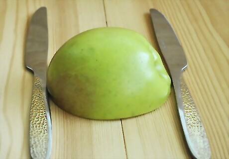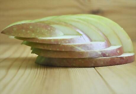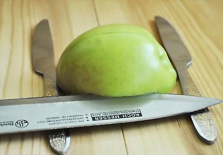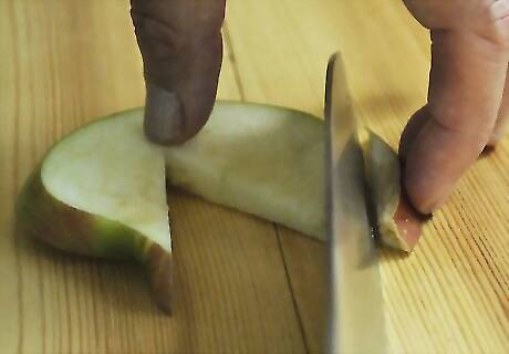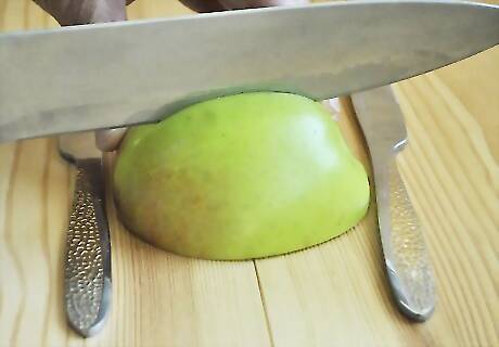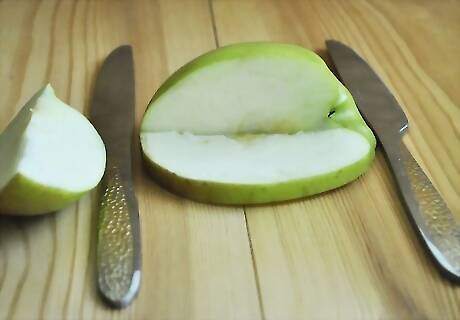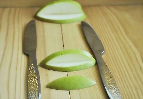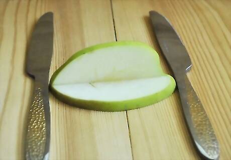 Place two butter knives on both sides of the apple. Take the larger side that has the base and top of the apple and place it flat on the cutting board. Place two butter knives perpendicularly at the base and the top of the apple. These knives will act as bumpers and prevent you from cutting through the entire apple.
