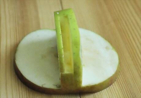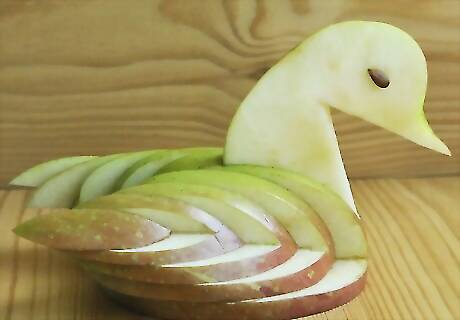 Take the slice of apple and make two diagonal cuts to form a V. Take the flat slice that you just cut and make two diagonal cuts near the top right of the slice of apple. This will start to form the head. Try to visualize what a swan's head looks like, or use reference photos from the web so that you can create the best swan head and neck.