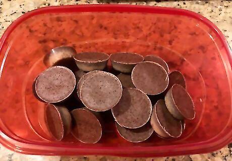 Remove cookie sheet with filled silicone mini muffin pan from refrigerator and push on the bottom of each mini muffin cup to pop out each bulletproof-style coffee pod. Store pods in a glass or plastic storage container with a lid in the refrigerator to prevent melting.