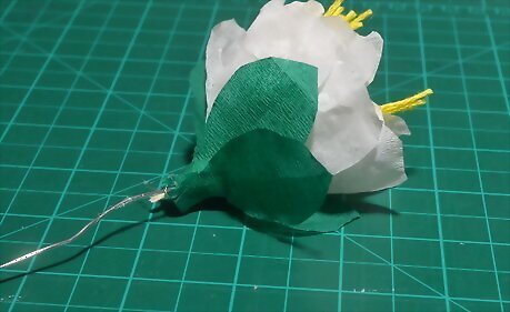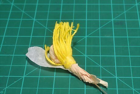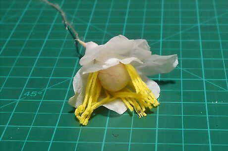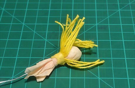 Cover the ball with yellow crepe paper and secure it to a wire stem. Place the ball on top of a green, wire florist's stem. Cover it with a small square of yellow crepe paper. Wrap and twist the crepe paper around the ball to secure it to the stem, just like wrapping a lollipop. Set the stem aside when you are done.