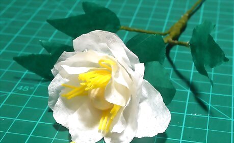 Glue the leaves to the bottom of the flower. Add a bead of hot glue to the tabbed part of the leaf. Press the tab against the stem, just below the bloom. Continue glue leaves all around the base of the bloom; you may not end up using all of them. Have these leaves pressed up against the base of the bloom.