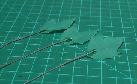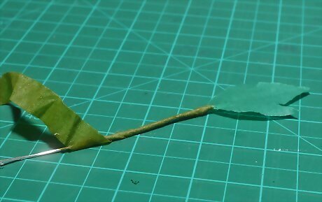 Wrap the top part of each leaf stem with florist's tape. Take your first leaf stem. Wrap green florist's tape around it, starting at the base of the leaf. Continue wrapping for 4 inches (10.16 centimeters), overlapping each later slightly. Tear off the tape, but don't trim the wire. Repeat this step for the remaining two leaf stems.