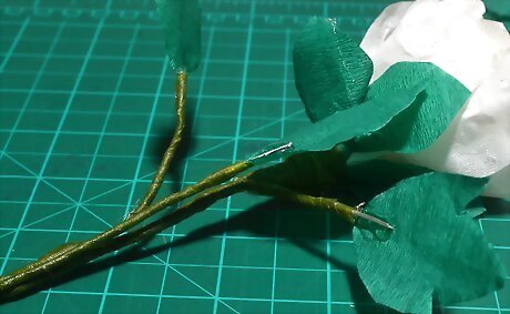 Secure the a leaf stem to the main stem. Place the a leaf stem against the main stem, just below the bloom. Make sure that the taped part of the leaf stem is sticking out, and the bare part is against the main stem. Secure the leaf stem to the main stem with green florist's tape. Wrap it around both stems for 4 inches (10.16 centimeters), then tear it off.