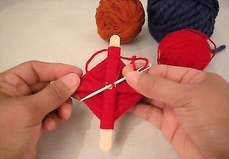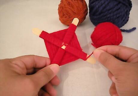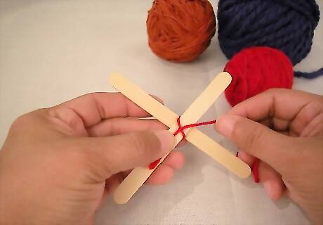 With the other hand, wrap the yarn over and around one arm of the X, then over and around the next arm, and so on. Pull the yarn tightly each time and push the yarn down snugly toward the center.