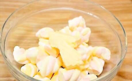 Melt the peeps. Add the butter to a small saucepan and place it over low heat. Slowly melt the Peeps in the melted butter. Stir continuously to avoid the mixture becoming burnt.
