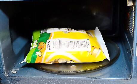 Microwave the popcorn. Follow the directions listed on your microwaveable popcorn bag. Be sure to listen to the crackles. Continuing to heat the bag when there is no noise, will result in burnt popcorn.