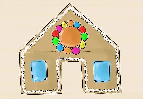 Use sugar glass to make windows for a gingerbread house. Place your gingerbread house walls on a sheet of parchment paper. Pour the melted candy into the window holes. Wait at one hour for the candy to harden. Gently pry the walls off the parchment paper. The candy will be hardened inside the window holes. Use icing to draw a frame around the window. You can also use icing to draw a # or + over the window to create a lattice. To create a stained glass look: use icing to glue different colored shards of hardened sugar glass behind a window opening. If your gingerbread house does not have window holes: put some square-shaped cookie cutters onto a sheet of parchment paper. Fill them with melted sugar glass. Wait one hour for the candy to harden, then pop it out of the cookie cutter. Use icing to glue the squares to a gingerbread house wall.