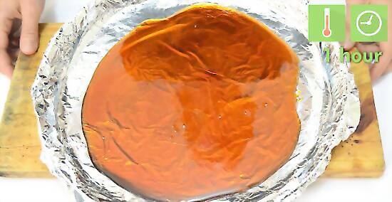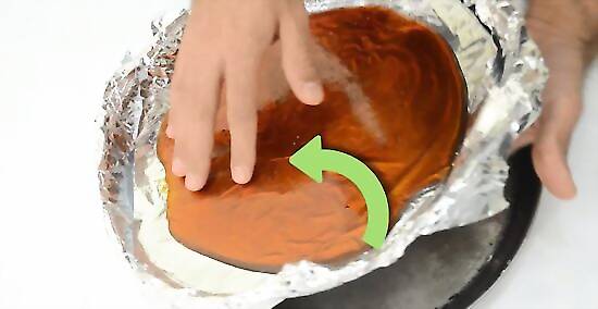 Pour the mixture onto the baking sheet and let it harden. Try to get the entire surface of the baking sheet covered. The candy will be thick and syrupy. It will take about an hour for it to harden.