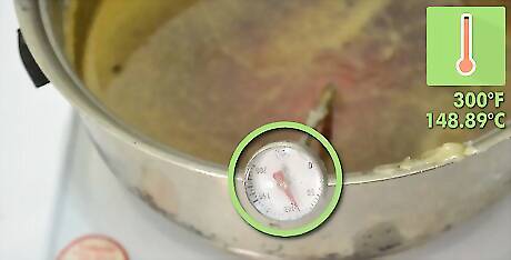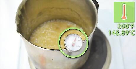 Heat the candy to 300°F (148.89°C), then remove it from heat. The candy must reach 300°F (148.89°C). This is known as the "hard crack" phase. If you do not get the candy hot enough, it will not set properly. Your candy will end up sticky no matter how long you let it sit or cool. It will take about an hour for the candy to reach the right temperature. The temperature will stop rising for a moment somewhere between 210 and 240°F (98.89 and 115.56°C). This is because the water is evaporating. Once the water has evaporated, the temperature will begin rising again. Keep the temperature between 300 and 310°F (148.89 and 154.45°C). Do not allow it to reach 320°F (160°C) or your sugar glass will caramelize and turn brown. If you do not have a candy thermometer, test the candy by dropping a tiny amount into a glass of cold water. The candy has reached the "hard crack" phase if it hardens into threads.