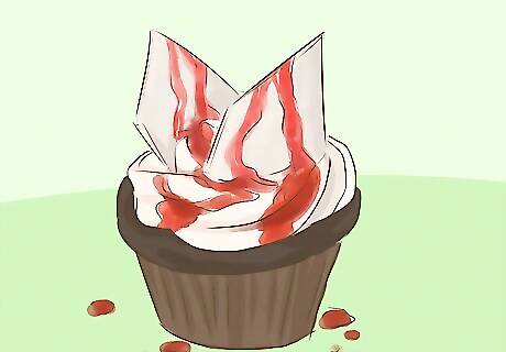 Use clear sugar glass and red gel frosting to top creepy cupcakes. Frost some cupcakes with white, buttercream frosting. Stick some clear, sugar glass shards into the frosting. Dribble some red gel/writing frosting over the top edges of the sugar glass. This is perfect for a scary Halloween party.