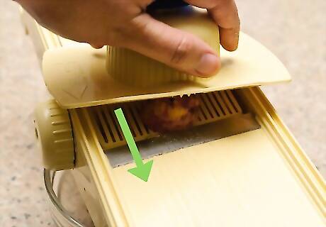 Heat the oven and adjust the rack. Turn the oven on to 250 degrees F (121 C). Move the rack in your oven so that it's in the center. This will ensure that the sweet potato chips bake evenly. You should also set aside one or two baking sheets. Consider using rimmed baking sheets. The rims can prevent the cooked sweet potato chips from sliding off of the sheet as you remove them from the oven.